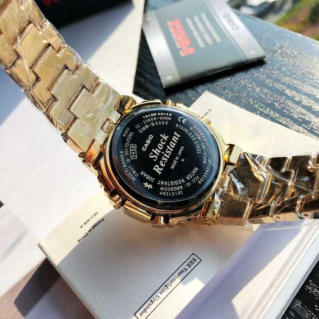 O DW-5000C é o modelo G-Shock original de 1983. A série GMW-B5000 herdou o seu design quadrado característico e recebeu o tratamento de metal completo, juntamente com funcionalidades aprimoradas, incluindo conexão a smartphones. O GMW-B5000-1JF recebeu uma caixa totalmente de metal usando um material de amortecimento de resina fina resistente a choques inserido entre a caixa e a robusta moldura de metal de aço inoxidável. A tecnologia de montagem de alta densidade também permite que o relógio mantenha o seu tamanho. A parte de trás do relógio possui uma trava de rosca sólida e foi tratada com DLC para maior resistência ao desgaste. Uma chapa ionizada dourada foi aplicada a toda a caixa e pulseira para uma bela cor. A visibilidade também foi aprimorada pelo uso de uma célula solar de filme e um STN-LCD (cristal líquido). Em termos de funções, esse modelo vem com comunicações Bluetooth® e pode ser vinculado a um aplicativo dedicado para obter informações precisas sobre o tempo. O relógio também conta com recursos práticos, incluindo um sistema de correção de tempo que usa sinais de tempo e frequência padrão (Multibanda 6), uma fonte de energia confiável na forma de tecnologia Tough Solar, iluminação de fundo LED totalmente automática de alta luminância, exibição de hora mundial e dia da semana em seis idiomas. Esse é um modelo G-Shock que se mantém fiel ao seu predecessor, enquanto passa por um refinamento adicional pela aplicação de um design totalmente metálico.